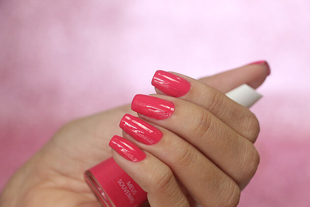 O Esmalte Meus Souvenirs é um esmalte rosa bem vibrante e alegre, me lembro alguma cor antiga, mas bemmm antiga, preciso procurar aqui no blog.